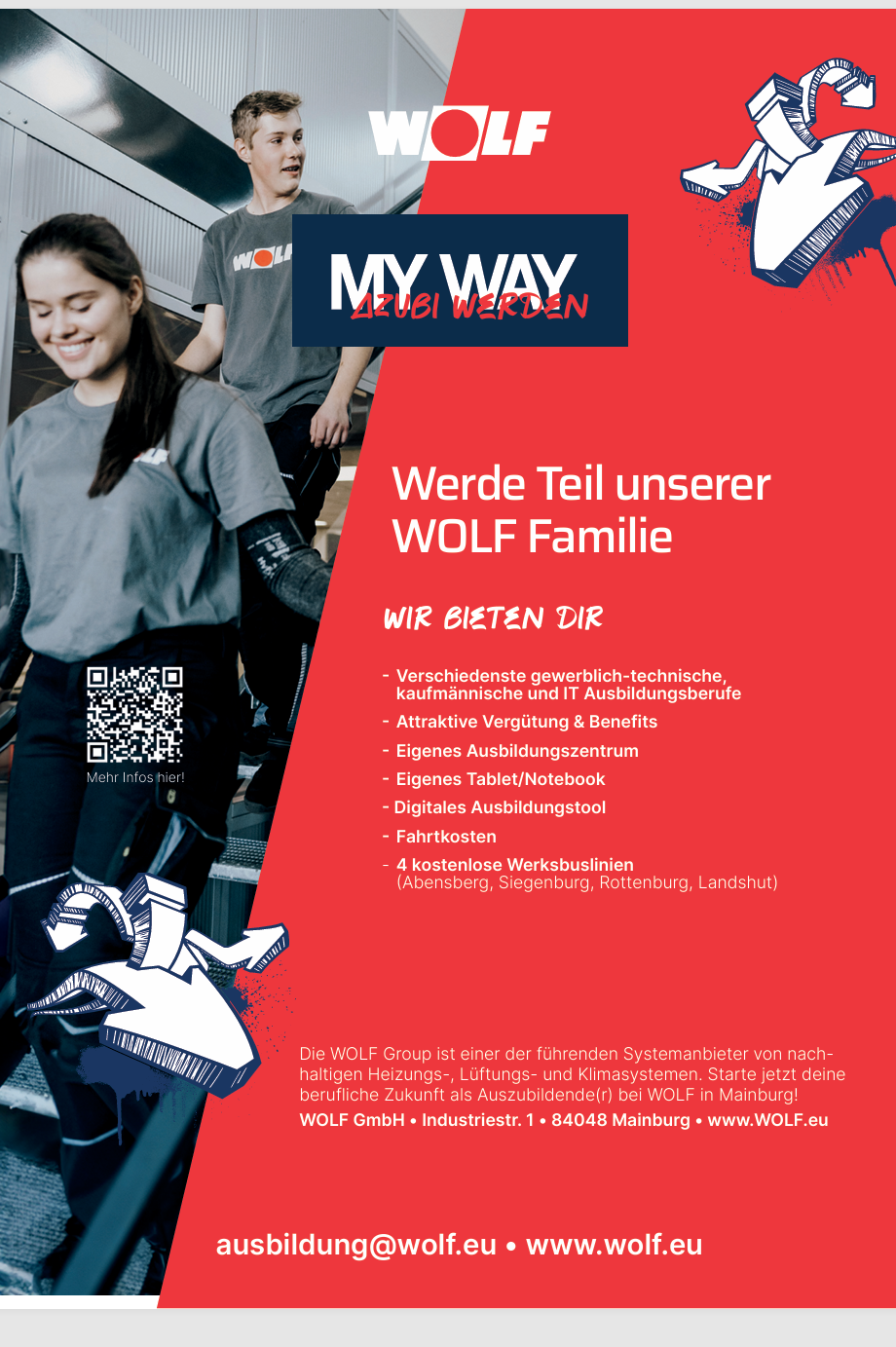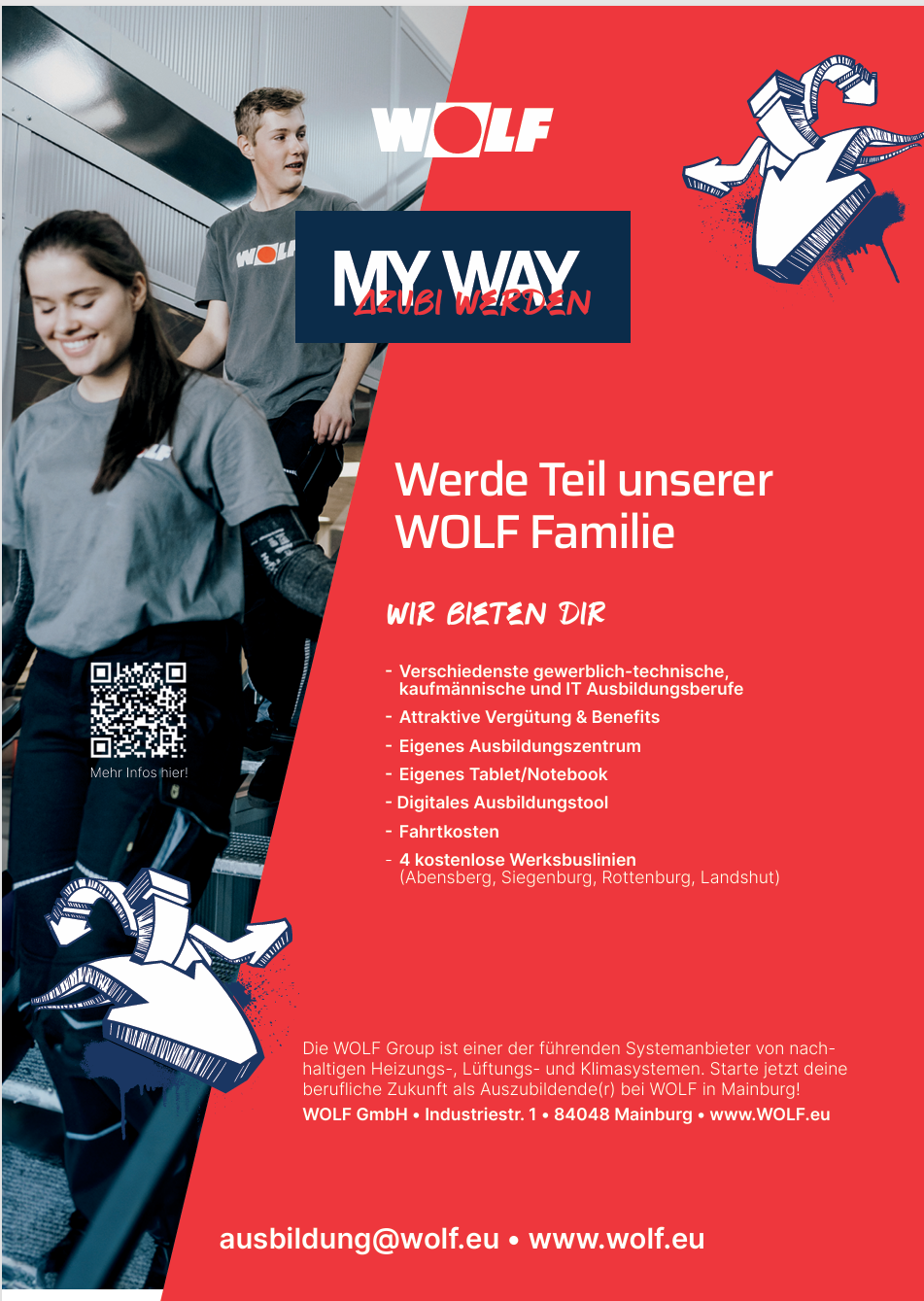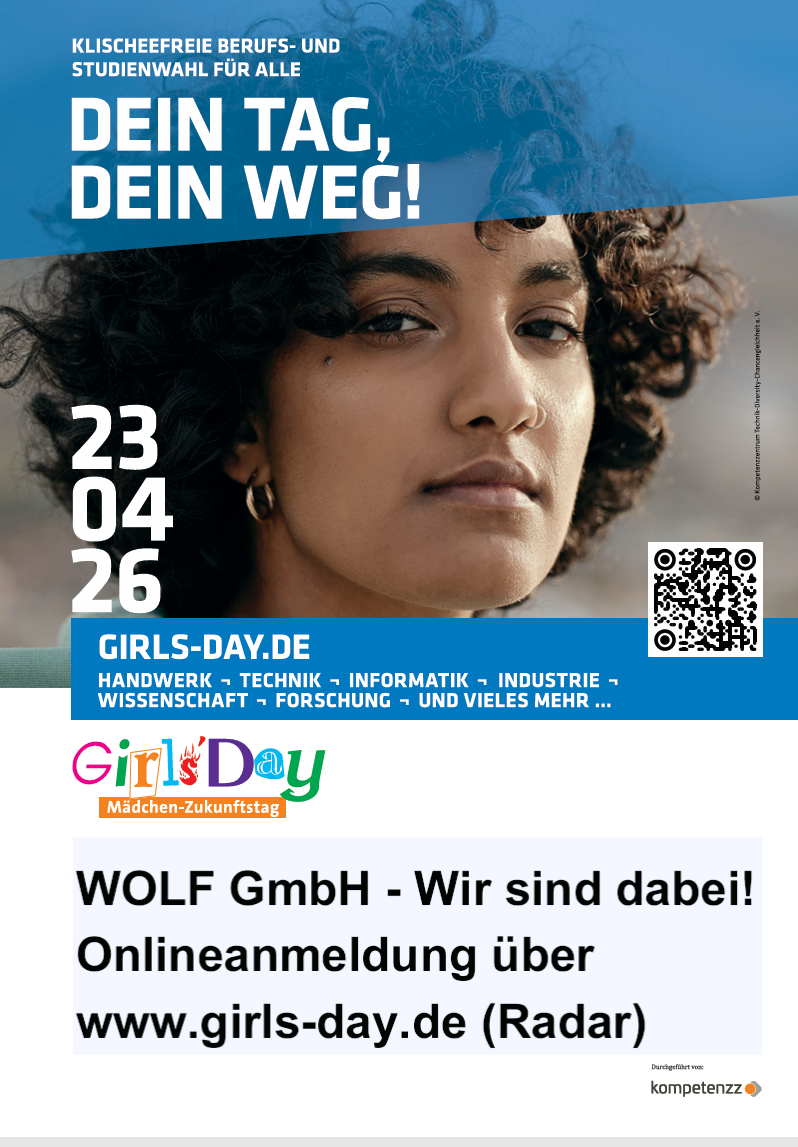 Bewerbungen sind nur Online über die Stellenbörse auf der Homepage möglich: https://www.wolf.eu/de-de/karriere/jobsSchülerpraktikaBewerbungen sind nur Online über die Stellenbörse – Ausschreibung Schülerpraktikum – auf der Homepage möglich: https://careers.aristongroup.com/job/Mainburg-SCH%C3%9CLERPRAKTIKUM-%28MWD%29-Main-84048/1168474801/Bitte berücksichtigen Sie:Im Zeitraum September bis Januar sind aufgrund der Grundausbildung der neuen Auszubildenden keine Schülerpraktika möglich. Zudem gibt es für kaufmännische Praktika nur noch feste Zeiträume in den Herbst-, Oster- und Pfingstferien.Berufsorientierung (siehe Anmeldeformular „Anmeldung 2026“)Hier bieten wir auch weiterhin Betriebserkundungen und Bewerbungstraining an – einfach Anmeldung an ausbildung@wolf.eu senden.Girls´Day 2026 - Wir sind dabei (Plakat im Anhang)Onlineanmeldung über www.girls-day.de (Radar). Die Plätze sind auf 25 begrenzt.Aktionen SchulenSollten Sie von der Schule aus Arbeitsplatzerkundungen oder andere Aktionen, wie z. Bsp. Interviews mit Unternehmen planen, bei denen sich die Schüler direkt bei den Betrieben melden müssen, bitte wir um vorherige Information, damit wir ggf. solche Tage frühzeitig planen können.Ausbildungsmessen 2026 – Wir sind dabei!- Samstag, 07.03.2026 – Tag der beruflichen Orientierung
